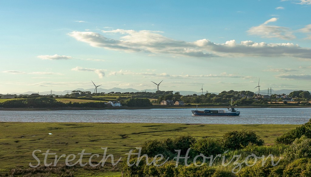 A cargo ship laden with machinery glides along the River Lune’s estuary towards the open sea: on this side of the camera is Glasson Dock and on the bank facing is Sunderland Point, with the wind turbines and pylons of the National Grid at Heysham piercing the tranquil sky.