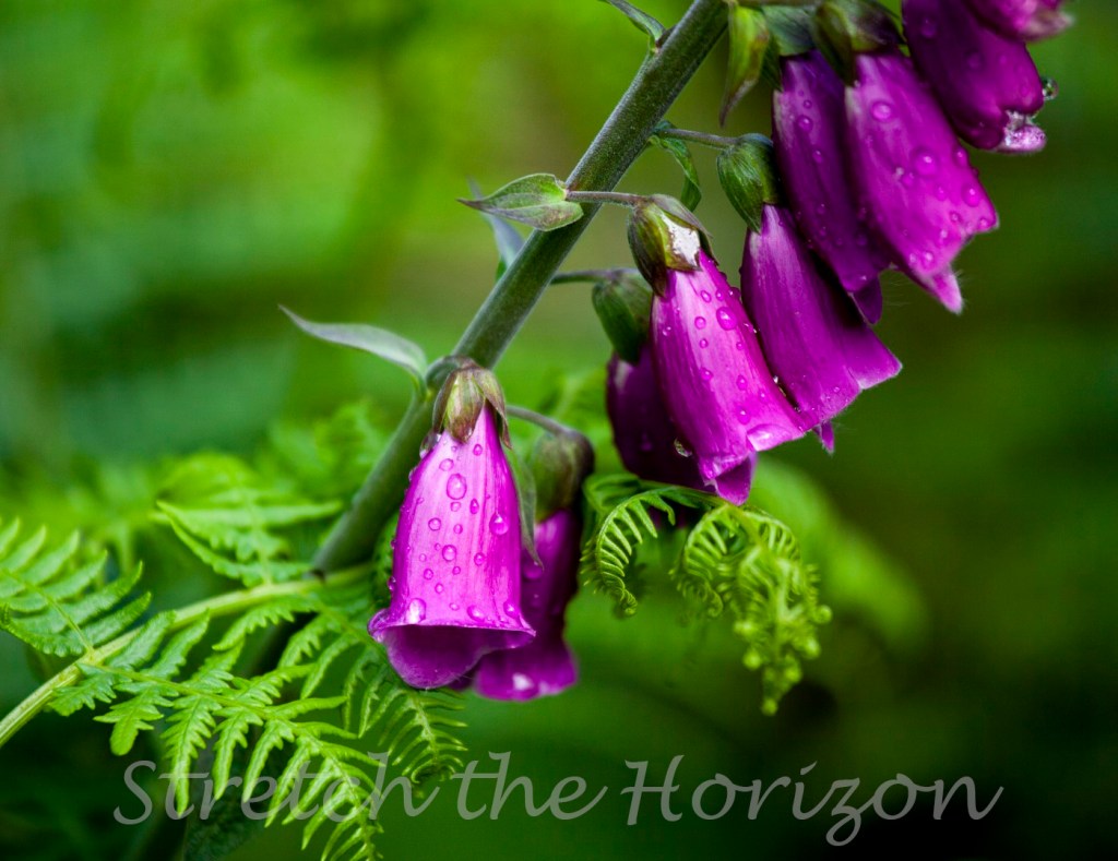 A rain-spattered Foxglove – its bell-shaped purple flowers bejewelled in droplets – thrusts between the unfurling leaves of a Fern, which grasps and consumes the undergrowth beneath its shadow spread: a clash of purple and green and a battle for Sunlight supremacy during the Summer months…