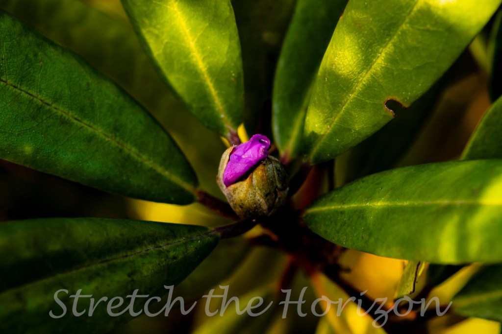 A Rhododendron begins to bust into life, its purple flower unfolding in time with the change in weather.