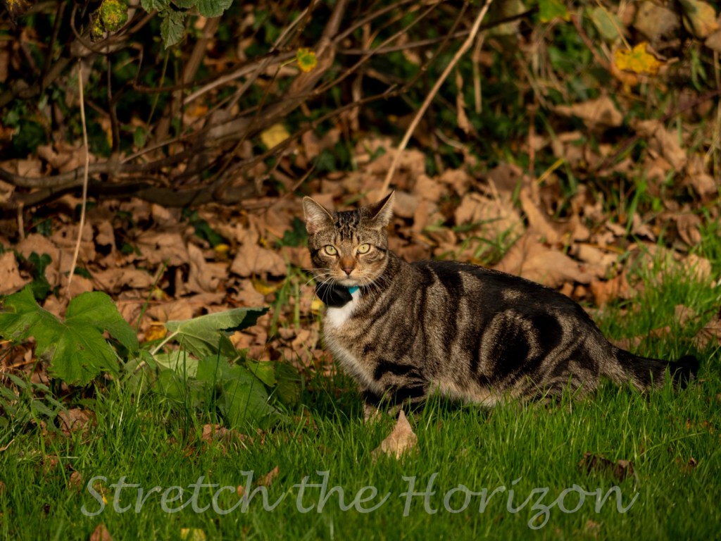 This Cat has been disturbed whilst being sneaky and trying to get close to a Blackbird, although with that electronic collar bulging from its throat, this feline’s killer instincts are probably being ‘regulated’ by some other battery-operated means…