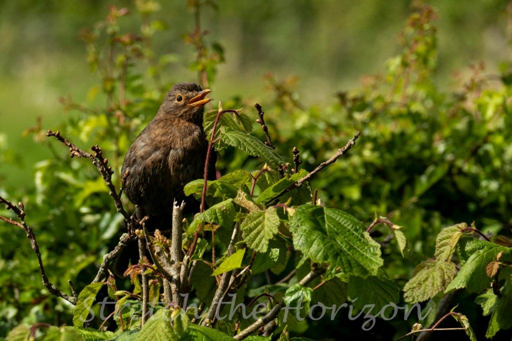 A female Blackbird – complete with dried mud on her beak from foraging for her brood – takes time out from this busy schedule to enjoy some ‘me’ time and relaxes with some personalised sunbathing.