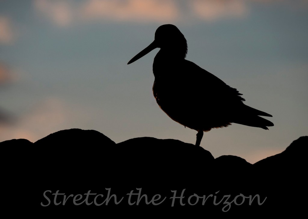 An Oystercatcher stands on one leg atop a drystone wall, silhouetted against the reddening clouds as the Sun sets in for the coming night and heralds the bird’s roosting time.