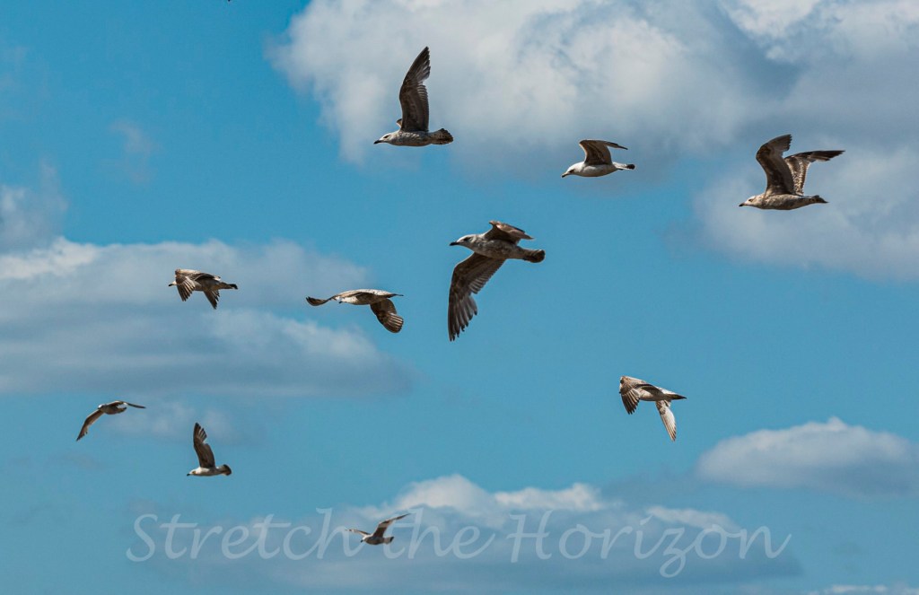 A variety of different juvenile Gulls – along with an adult Seagull – swirl above the beach at Morecambe’s Westend area, awaiting a promenade visitor to either feed them their lunch leftovers or to take a chance and divebomb a visitor’s unguarded snack!