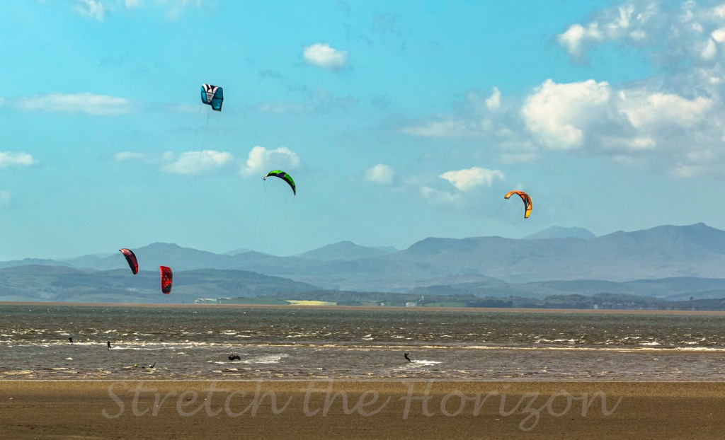 Kiteboarders take to the sea across Morecambe Bay in Morecambe, UK, their multi-coloured, wind-stretched kites dragging the daring surfers at speed across the wave’s breaking crests.