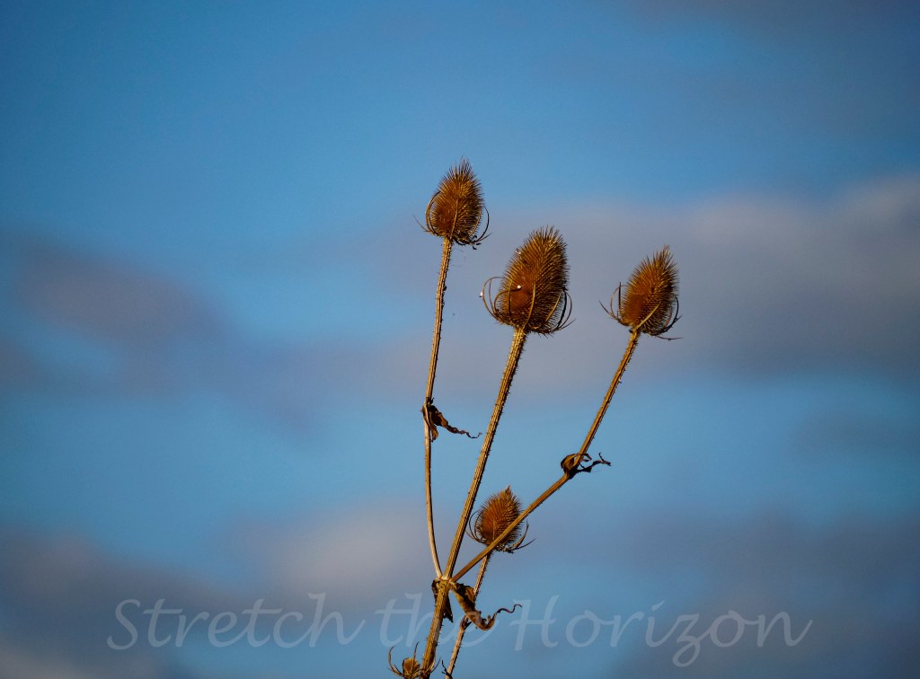 A wild Teasel (Dipsacus Fullonum) towards the end of Summer, its spikey seed-heads now all spent, browned and brittle for reclaiming in the coming Autumn/Winter cycle.