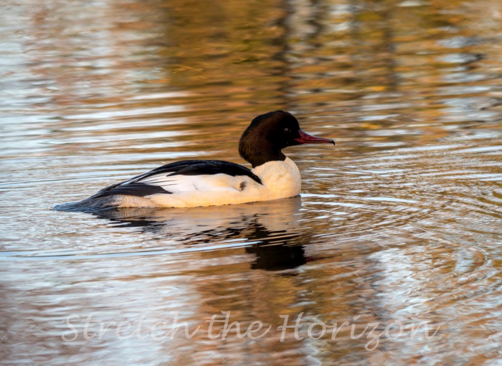 A male Goosander (mergus merganser) drifts casually along the Lancaster canal in search of its next meal of fish, with its red bill lined with saw-like teeth, denoting why this diving duck belongs to the sawbill family genus.