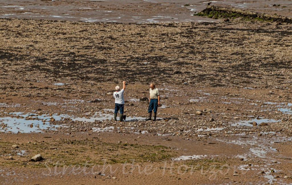 Down on Heysham beach as the tide’s out in Morecambe Bay, two blokes are assessing the size and weight of their ‘winkles’… (which are molluscs, that they have obviously foraged and collected from the mud and tide pools that is)!