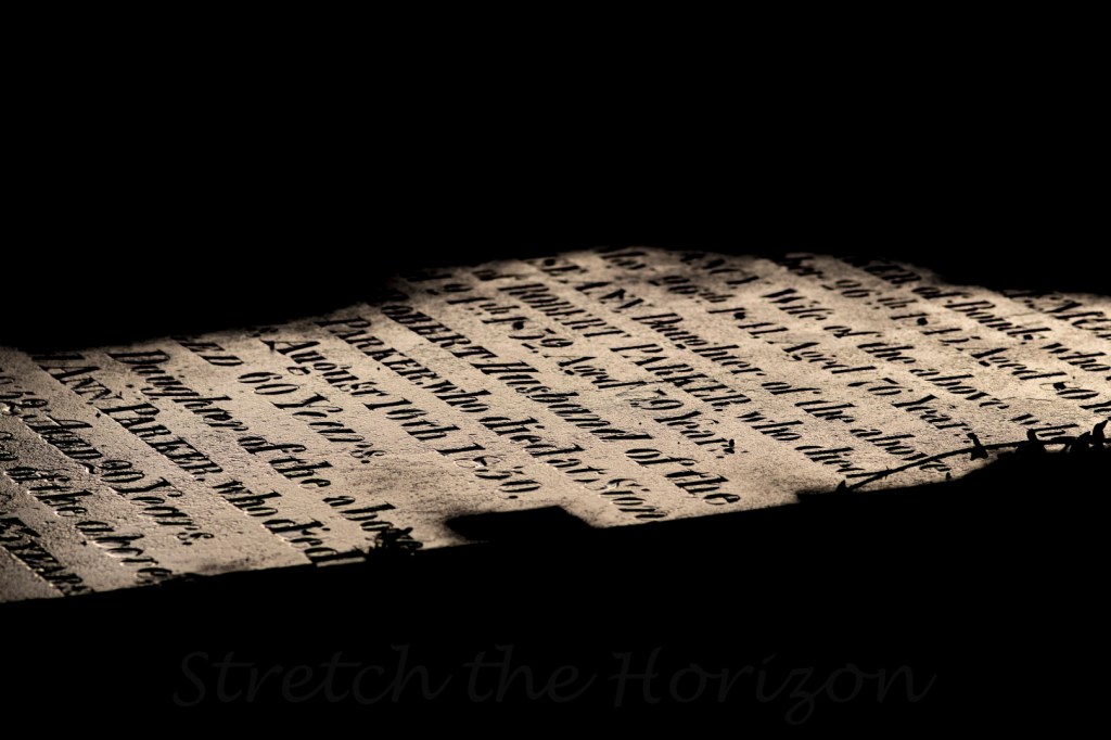 Lying in partial shadow but lit through a fracture in the surrounding foliage, this gravestone reveals peoples’ names, their family connection and the dates they passed away from centuries ago…