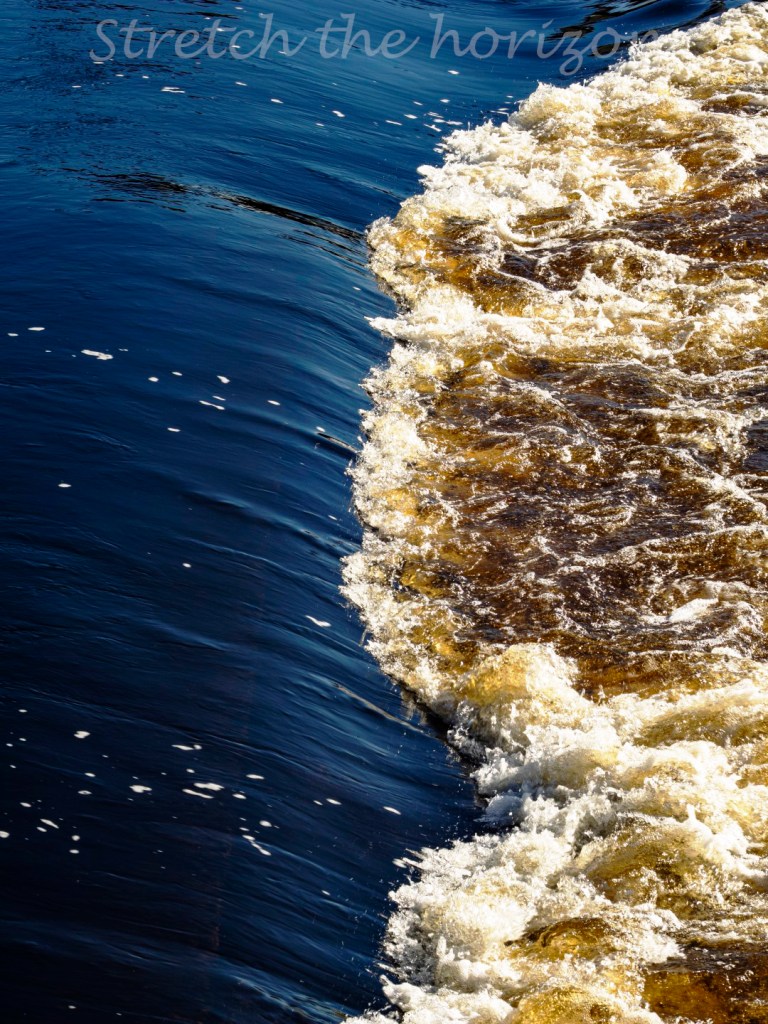 Where the deep blue tidal flow of the river Lune crashes across a weir, churning the lunar-pulled water into a white-capped cascade.