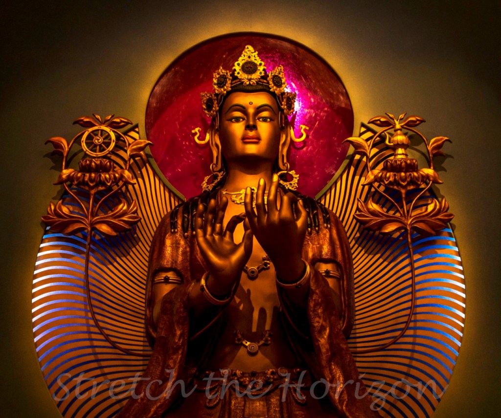 An ultra-vivid shot of a statue of enlightenment standing within the Manjushri Kadampa meditation centre Conishead Priory at Ulverston, Cumbria in the UK.
