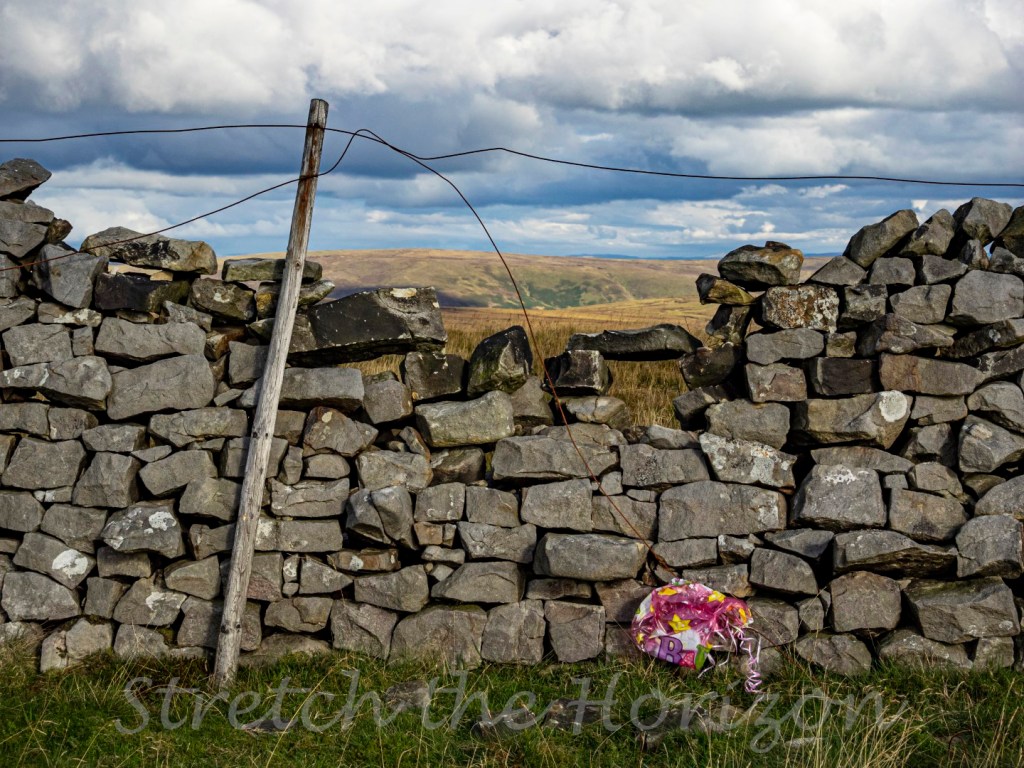 High up in the Forest of Bowland near the desolate peak of Wolfhole Crag (527m/ 1729ft) flutters this stranded birthday balloon, its garish-neon finish contrasting against the grey drystone wall, the freshness of the clouded canopy and the distant moorland’s muted hues…