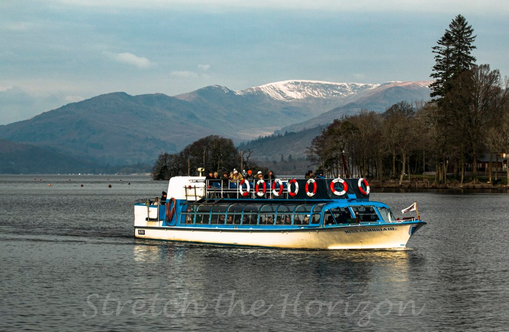 A shot of Miss Cumbria III tour boat on Windermere, as the craft approaches docks at Bowness-on-Windermere to deposit its many sightseers, with a stunning rear vista at the far end of England’s largest natural lake.