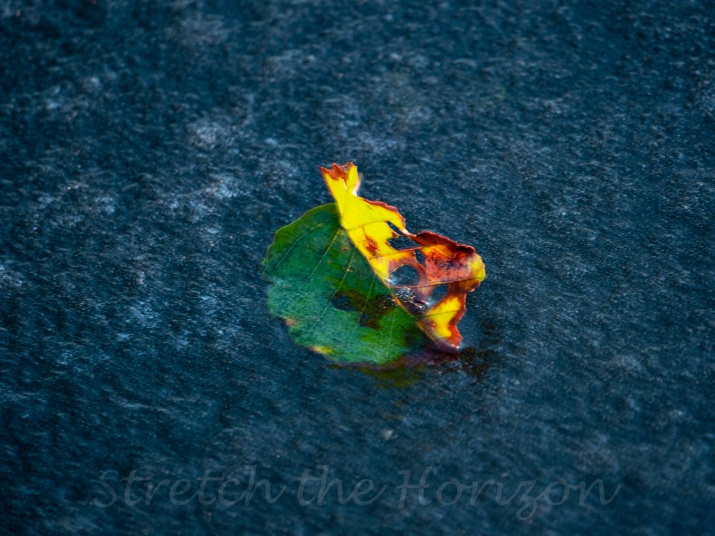 Two fallen leaves have become frozen in the icy surface of nearby water, with one leaf still retaining its green Summer jacket and the other wearing the vibrant hues of Autumn’s decay…