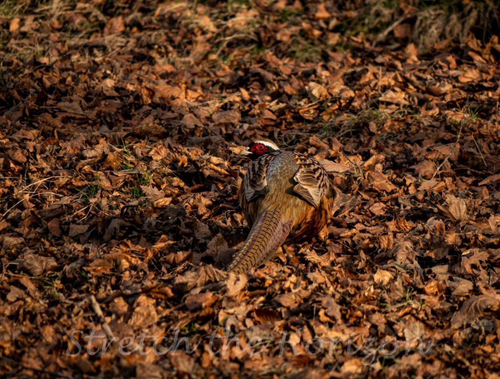 This male Pheasant’s drab back plumage is the perfect camouflage for rummaging around in last Autumn’s leaf-fall, although he has now given himself away by looking behind and flashing his vivid, crimson eye patches for all to see!