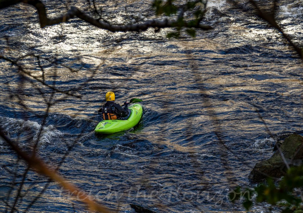 A yellow-tipped canoeist tackles the white-water tidal flow of the river Lune at Halton, Lancaster in the UK, skating the tumultuous surface in their fluorescent-green canoe.