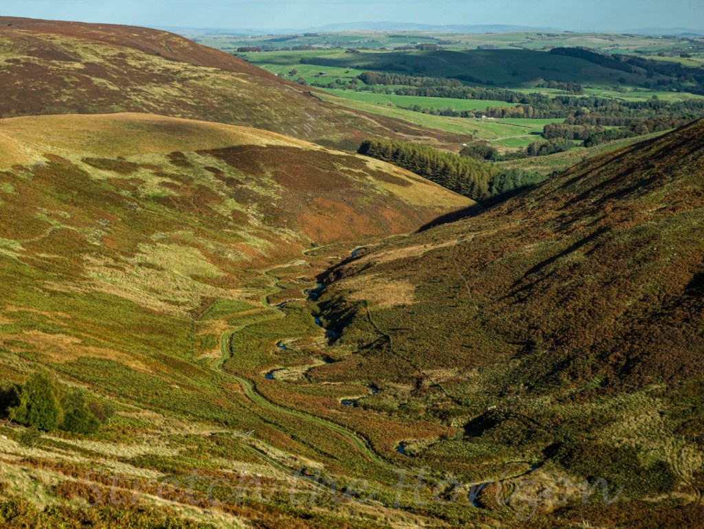 A shot taken from the slopes of Hareden Fell in the Forest of Bowland, looking along Hareden Brook’s serpentine coils as it merges with the wider Langden Brook and flows on towards Dunsop Bridge off in the distance.