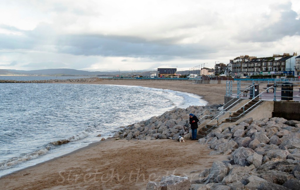 Being pulled by his eager pooch, this wrapped-up man is getting ready to face off against Morecambe Bay’s seasonal elements…