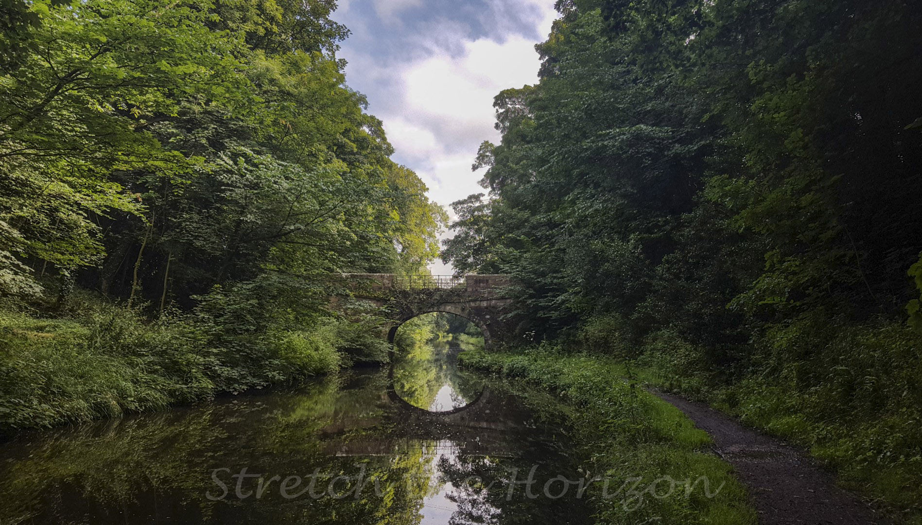 The old and overgrown stone bridge 93, that spans the Lancaster canal at Bailrigg in Lancaster, UK and allows a variety of livestock to cross the industrial waterway from one field to another.