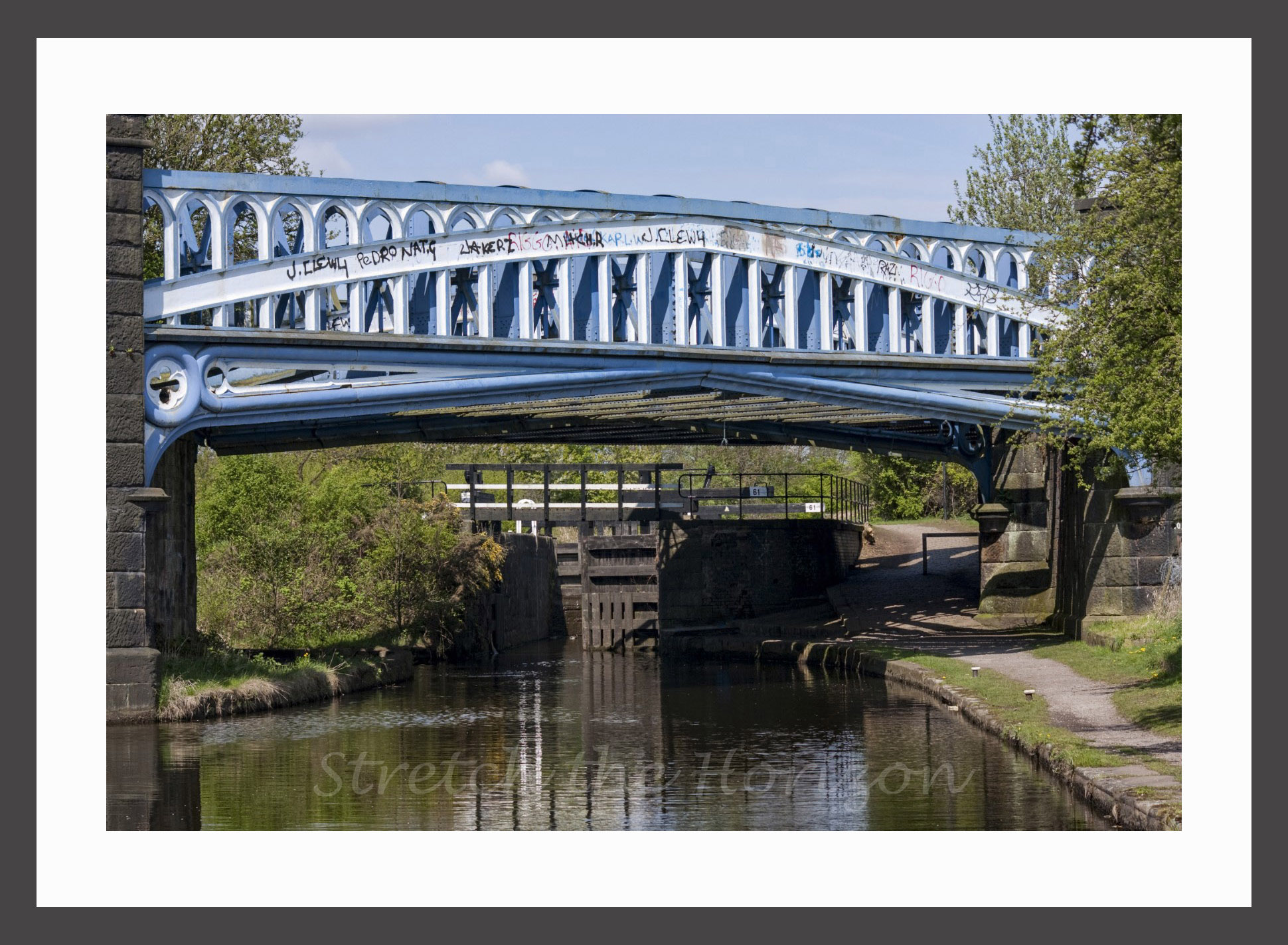 “Th’ Iron Donger” cast iron railway bridge – it is in fact two bridges side-by-side – stands on the boundaries of Chadderton and Middleton in Manchester, UK. Its cast iron span has straddled the Rochdale canal since its completion in 1863 and although it has been decommissioned many years ago, the blue and white graffitied behemoth still stands in place, casting its dark, post-industrial shadow onto anyone passing on the towpath below…